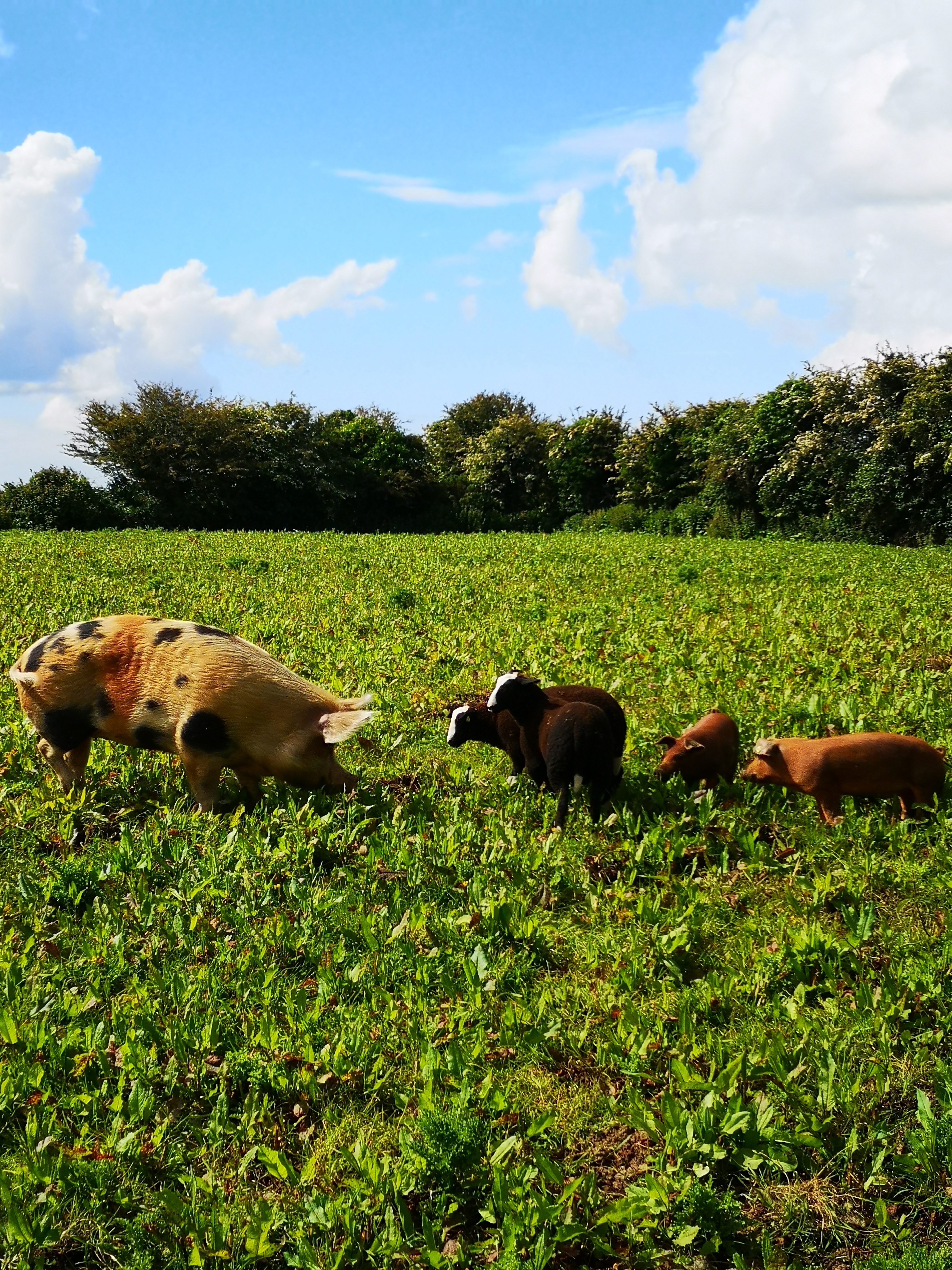 I love watching them. They seem very relaxed. When it’s windy or raining they shelter under the hedge of hawthorn and are warm and dry. They’ve even dug a bank to lie against. They are super cool with the pigs. The little pigs charge up to them to say hello in the morning. I always knew that pigs are socially very advanced but to observe their interactions with the sheep really confirms this.