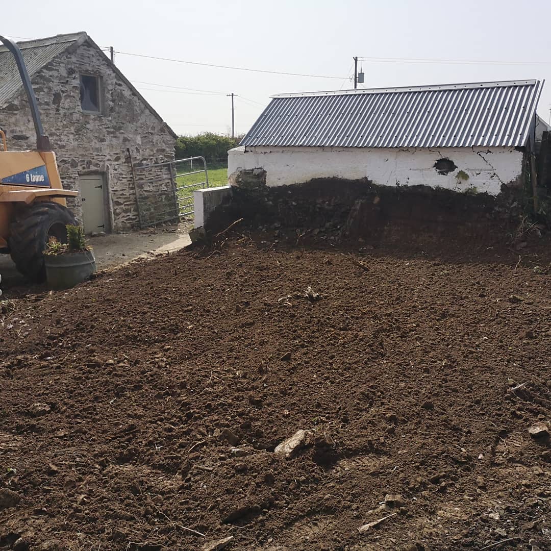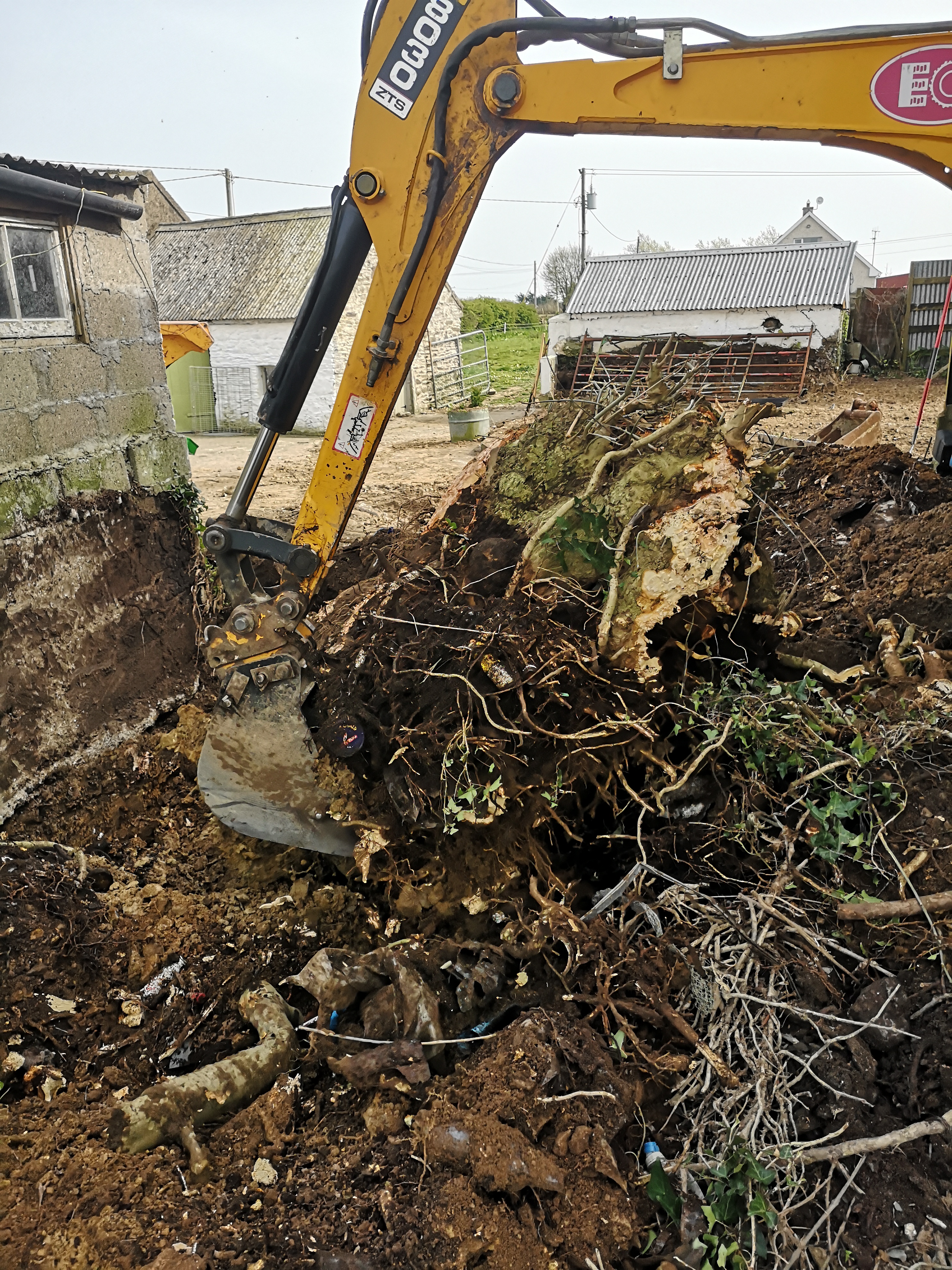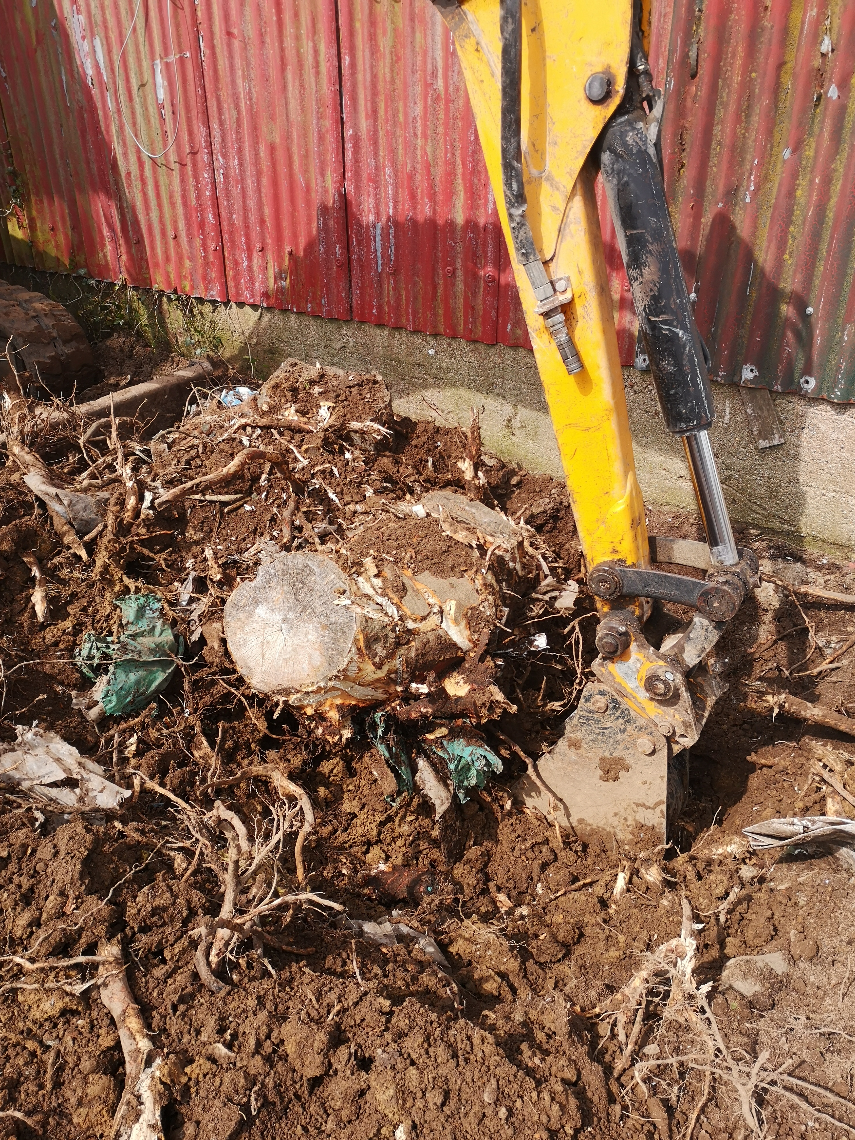 He proceeded to remove mounds of stuff before tackling the tree stumps. The old pig sty which I now use as a henhouse had had a mound of soil dumped in front of it from when they dug out the septic tank. I knew there was plastic in it because last summer we tried to remove it and gave up. He dug away at it and then called me. He reckoned the wall would cave in if he went any further. I told him wall was sound from inside and to keep at it. He did and got the stumps out. What was revealed was the stone rubble base which will be left to dry out and we can hopefully repair.