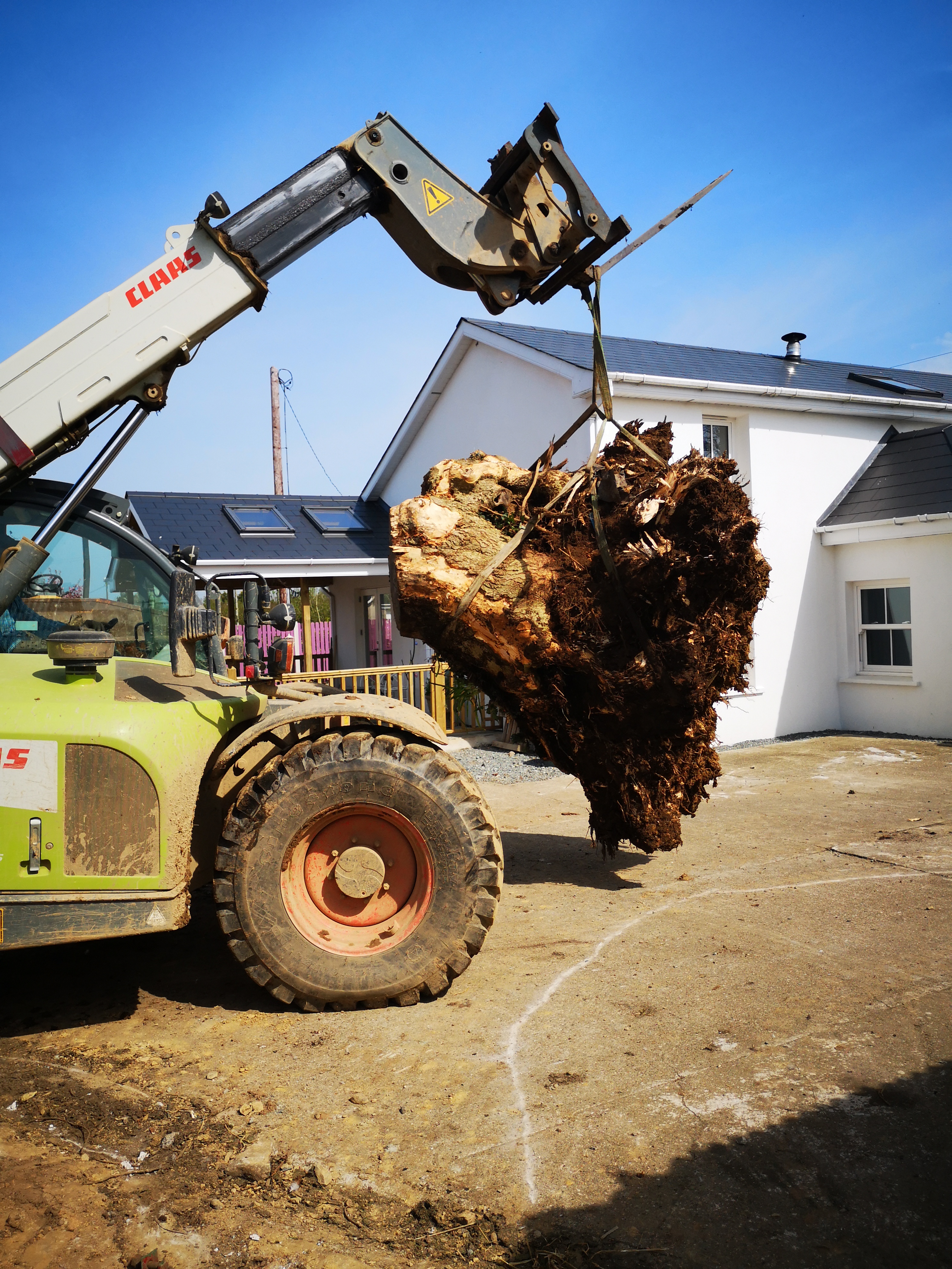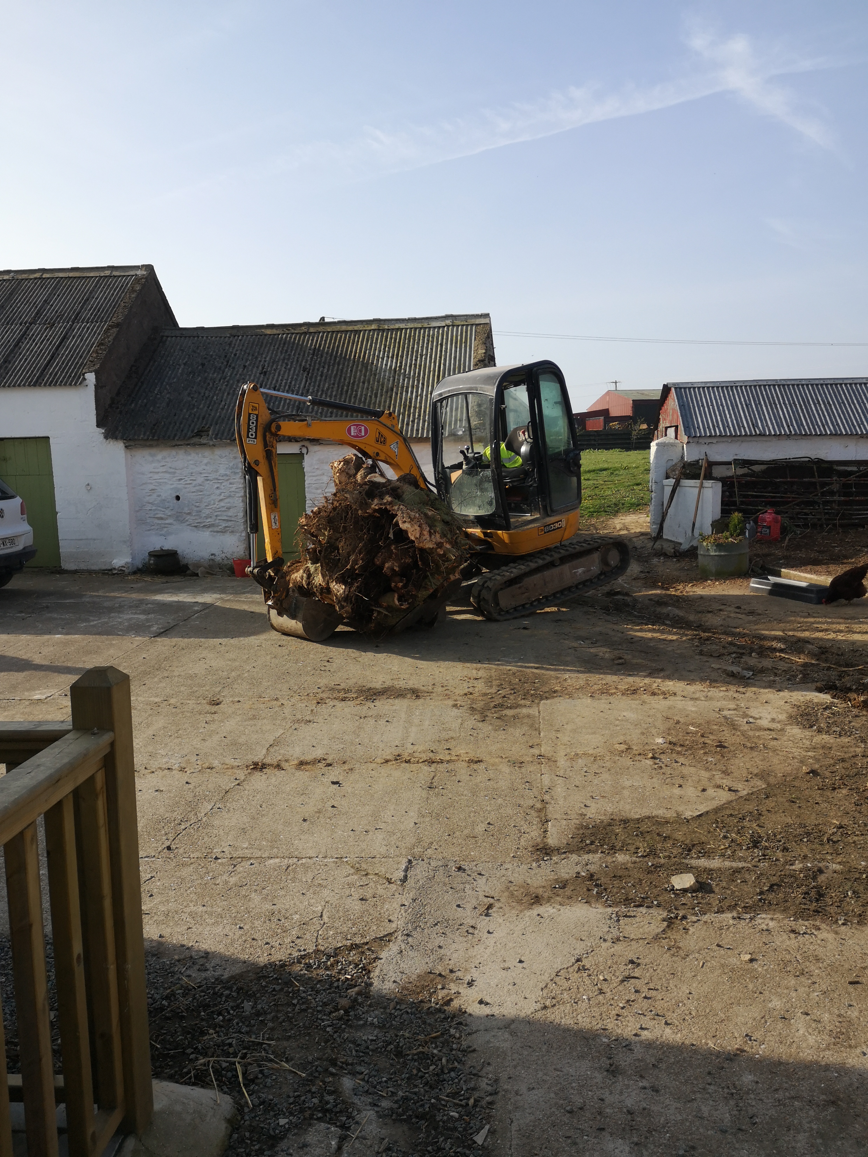 Next day they arrived back to take the other one out. I had to leave to collect the new piglets. I was only going to outside Clonroache, 20 miles or so away but it would take me 40 mins. The roads around here are designated “R” rural or “L” local. R should stand for rubbish and L for ludicrous. When I got back what greeted me was the first photo here. They had got the second stump out but had to call a friend with a teleporter to remove it. It was so massive it was one third the size of my sheds. Do not allow sycamores to seed and grow near buildings. This had to be less than 70 years old. They hardly built the sheds on a sycamore…….