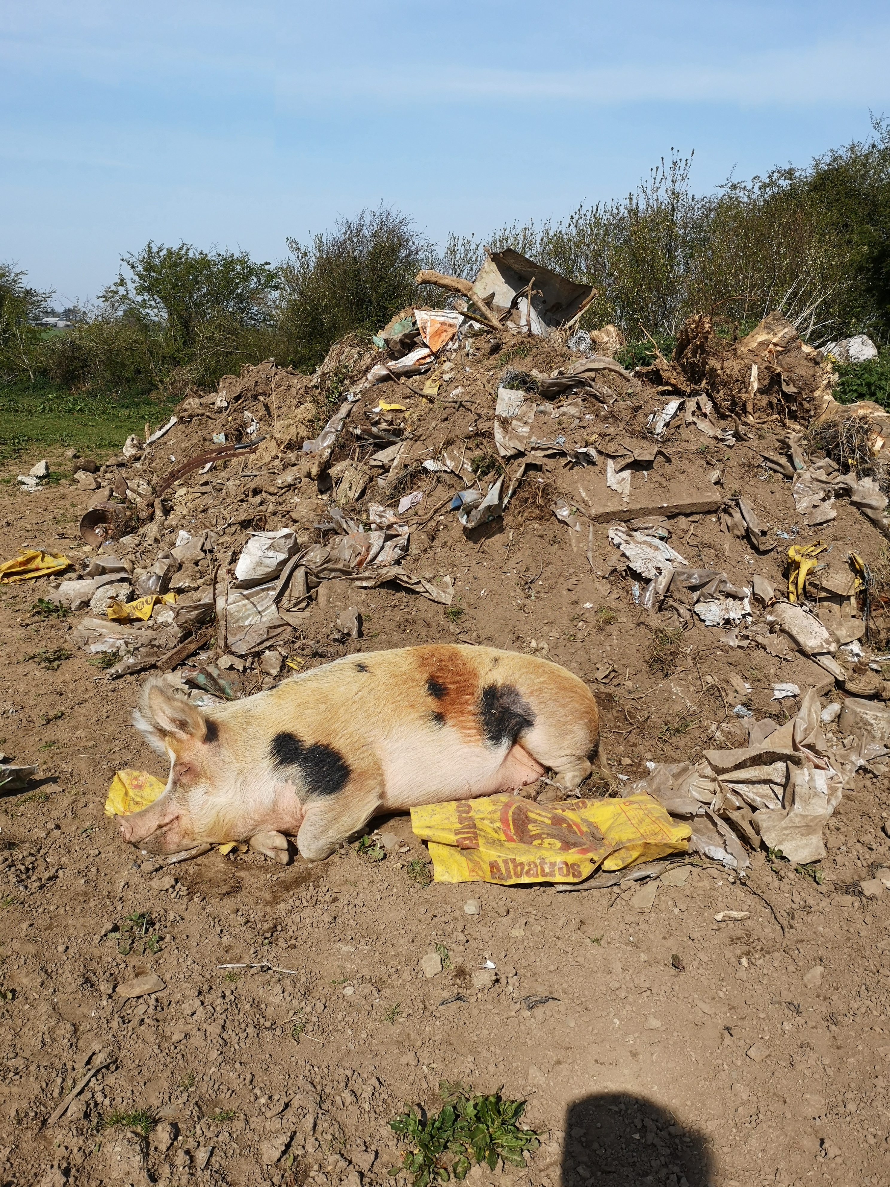 Today I went out to take stock and commune with the pigs, as I do. The mound added to the previous building rubble mound (from house renovations), stunned me but not because of the size – which is huge, but because of the plastic pollution in it.